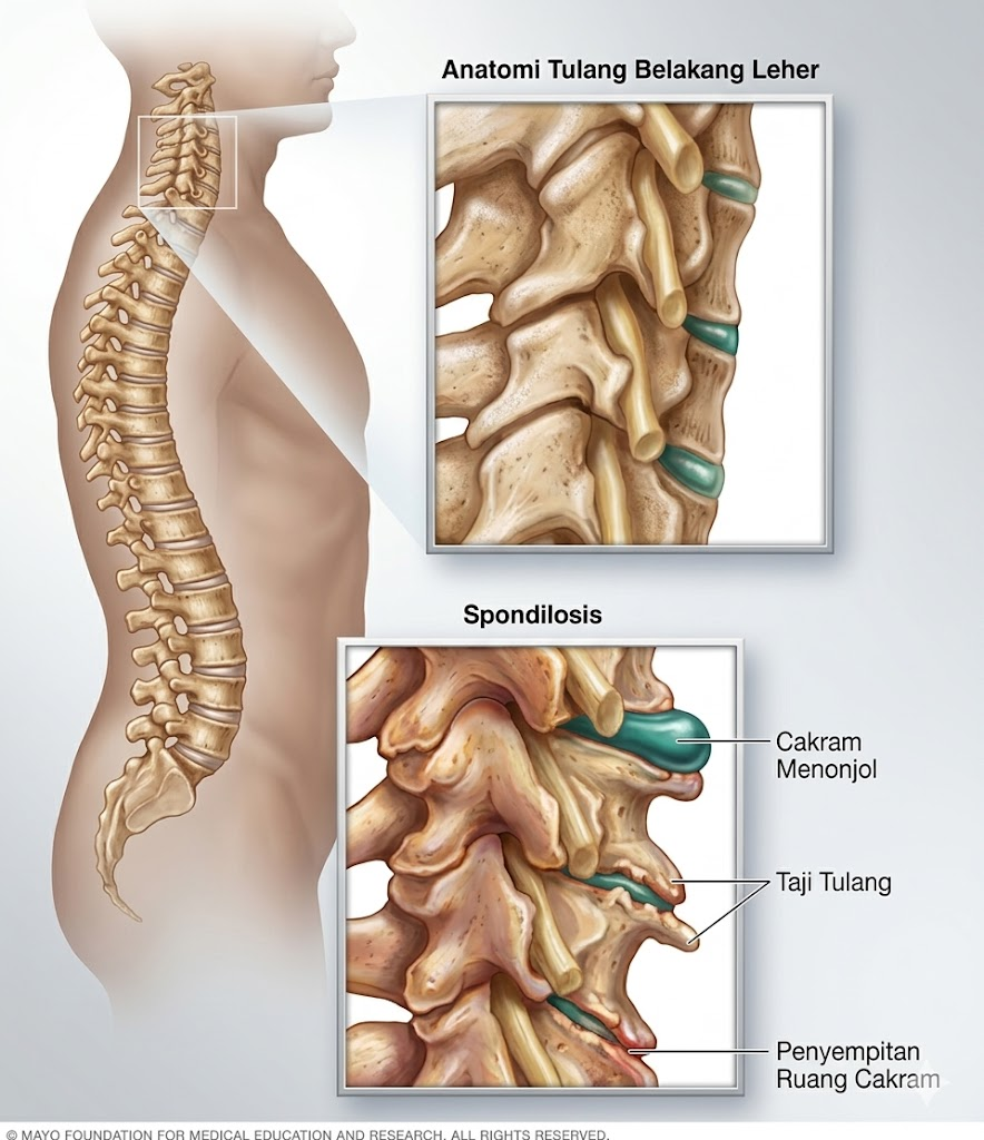 Cervical spondylosis adalah kondisi degeneratif kronis yang memengaruhi tulang belakang leher, mencakup perubahan pada cakram intervertebral, sendi faset, sendi unkovertebral, dan ligamen di regio servikal. Kondisi ini merupakan penyebab utama kompresi sumsum tulang belakang dan akar saraf di leher secara progresif, dan termasuk dalam kelompok yang lebih luas yang dikenal sebagai degenerative cervical myelopathy (DCM). Meskipun menjadi salah satu kondisi muskuloskeletal paling umum di kelompok usia dewasa dan lansia, cervical spondylosis masih sering dianggap sekadar “penyakit tua biasa” yang tidak memerlukan perhatian serius — padahal tanpa tata laksana yang tepat, kondisi ini dapat berkembang menjadi gangguan neurologis permanen.