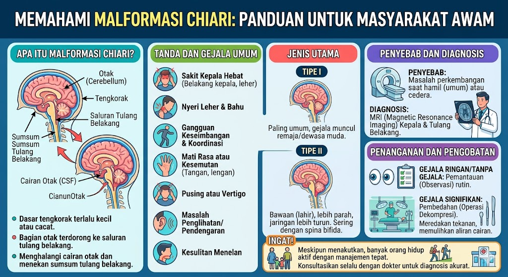 Pernahkah Anda atau orang di sekitar mengalami nyeri kepala yang selalu muncul saat batuk, bersin, atau mengejan — nyeri yang terasa seperti ada sesuatu yang “tertarik” dari bagian belakang kepala? Gejala seperti ini, yang kerap dikira migrain biasa atau ketegangan otot leher, bisa jadi merupakan salah satu tanda dari kondisi neurologis yang disebut malformasi Chiari, atau dalam literatur medis dikenal sebagai Chiari malformation.