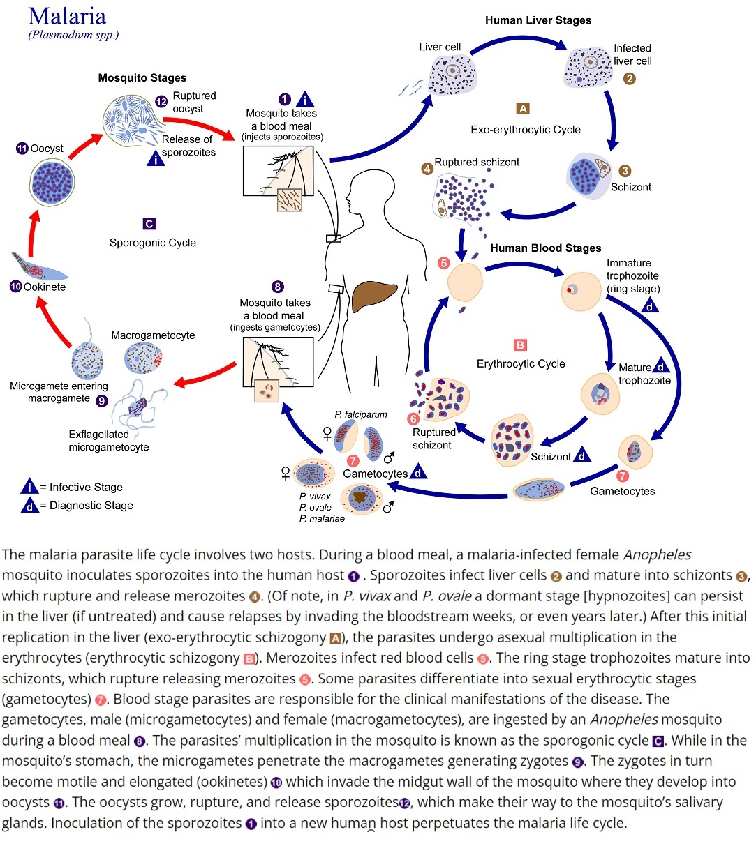 Siklus penularan malaria melibatkan dua inang: manusia dan nyamuk. Ketika nyamuk Anopheles menggigit manusia yang terinfeksi, ia menghisap gametosit — bentuk seksual parasit — yang kemudian berkembang biak di dalam tubuh nyamuk. Parasit dewasa dalam bentuk sporozoit bermigrasi ke kelenjar ludah nyamuk. Saat nyamuk ini menggigit manusia sehat, sporozoit masuk ke aliran darah, menuju hati, berkembang biak, lalu menyerang sel-sel darah merah. Penghancuran sel darah merah secara bergelombang inilah yang menimbulkan gejala demam khas malaria.